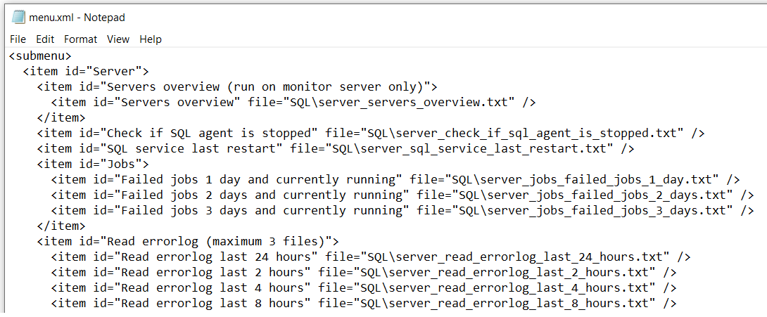 If you right click in the left server list the menu will appear. Behind every menu there is a SQL query. The menu can have multiple levels, so for example Server, Configuration, All settings. Example from the menufile. The main menu item here is 'Server' ![]() The id defines the menu item and the file defines the textfile with the SQL query that will be executed when that menu item is clicked. |