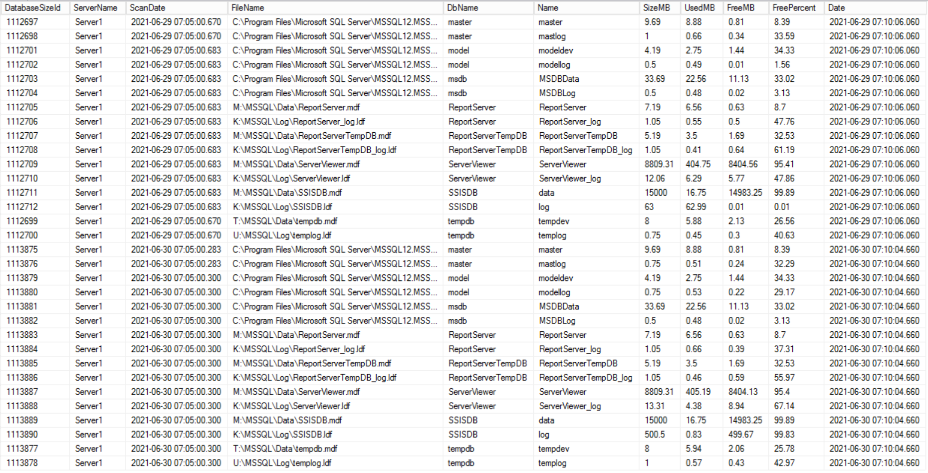 Example content for table DatabaseSize for Server1 for two days: