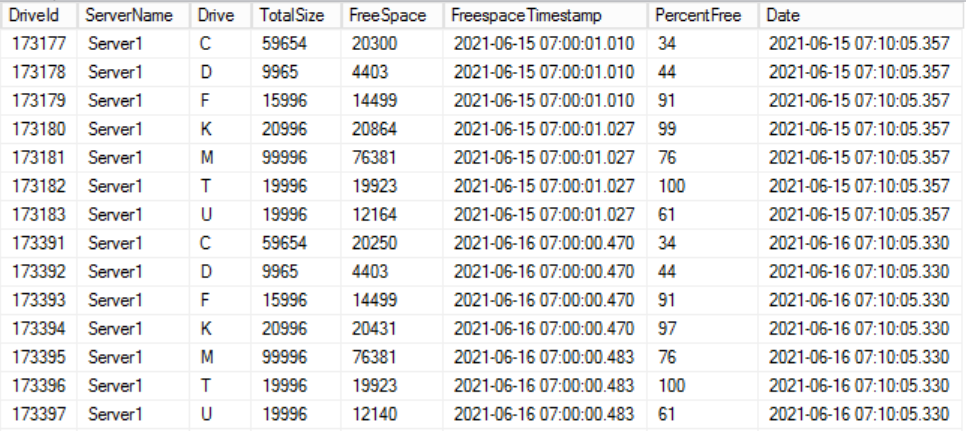 Extra tables for more reports. Last changed: 31 March 2024 Create tables To create more reports some extra tables should be created. The tables which are needed to show a historical view for the diskspace, database growth, the last serverinformation and whether a server is up to date with server updates Create four extra tables in the database ServerViewer. -- Drives -- DatabaseSize -- ServerInfo -- ServicePackInfo Drives Create the table 'Drives', this contains the diskspace. Fill this daily. See SQL articles. DatabaseSize Create the table 'DatabaseSize', this contains the database usage and size. Fill this daily. ServerInfo Create the table 'ServerInfo', this contains information about the server. Fill this daily. ServicePackInfo Create the table 'ServicePackInfo', update when a new SP or CU or SU or GDR or Hotfix is released. Example content for table Drives for Server1 for two days: