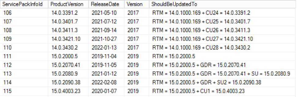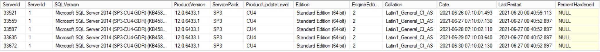 The info comes from sys.dm_os_sys_info. Example content for table ServicePackInfo for 2017 and 2019: ![]() See Examples for the reports created with these tables. |